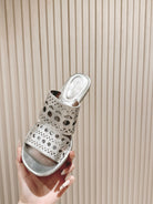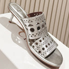Alaia 2025 Vienne Cutout Kitten-Heel Slide Sandals Silver Leather 293647