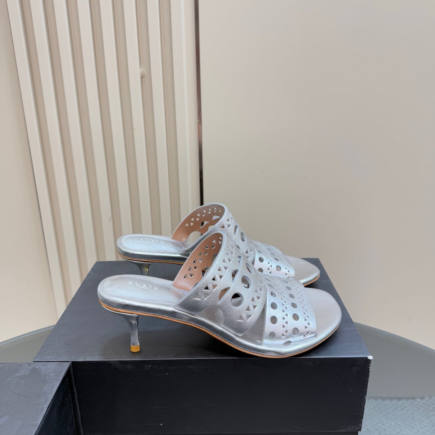 Alaia Vienne Cutout Kitten-Heel Slide Sandals Silver Sheepskin 299664