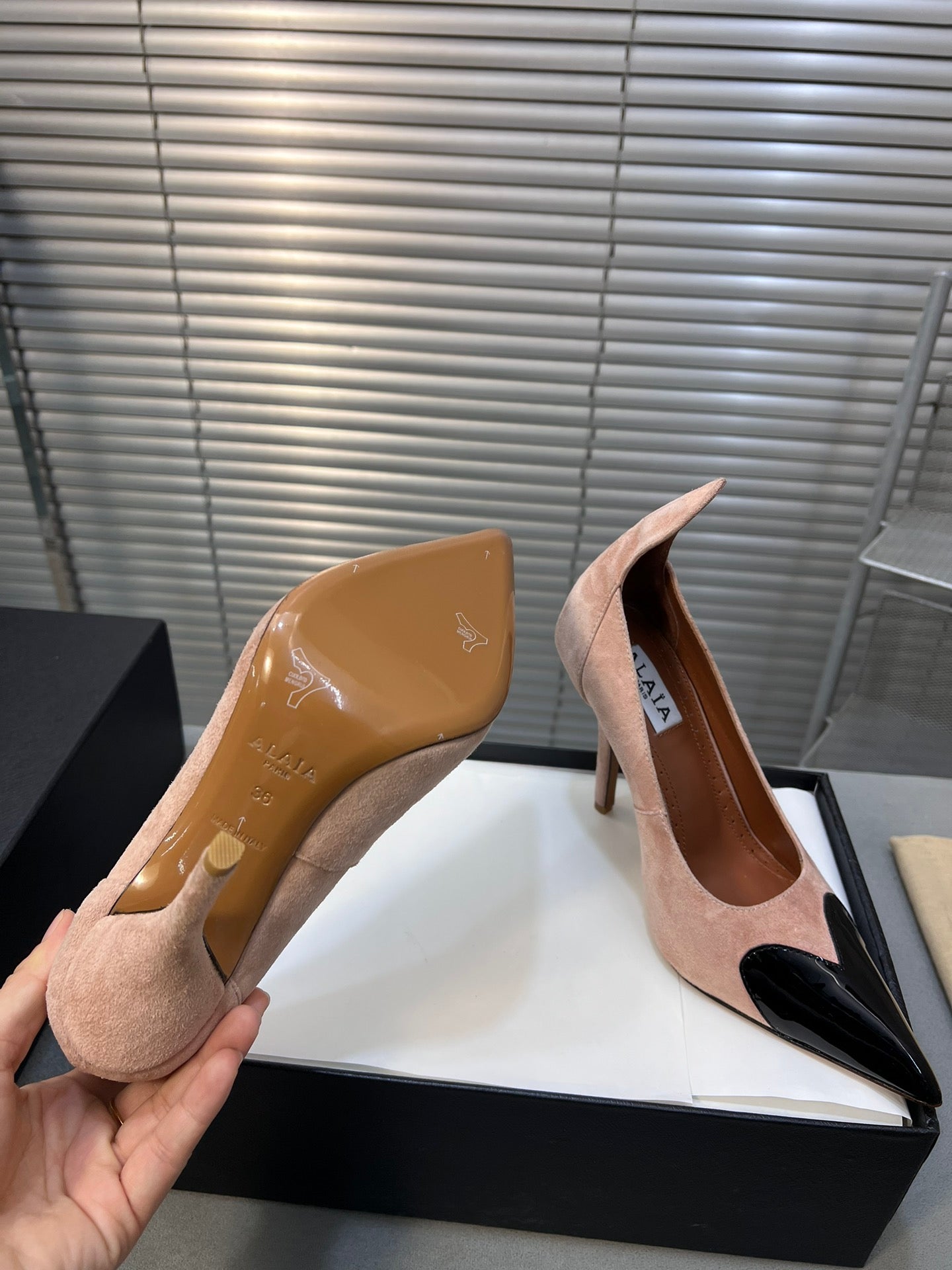 ALAIA HIGH PUMPS 10CM IN ALMOND BEIGE SUEDE MIX BLACK CALFSKIN