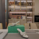 BOW-EMBELLISHED HIGH MULES IN WHITE SHEEPSKIN