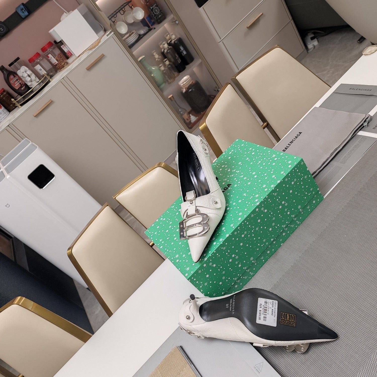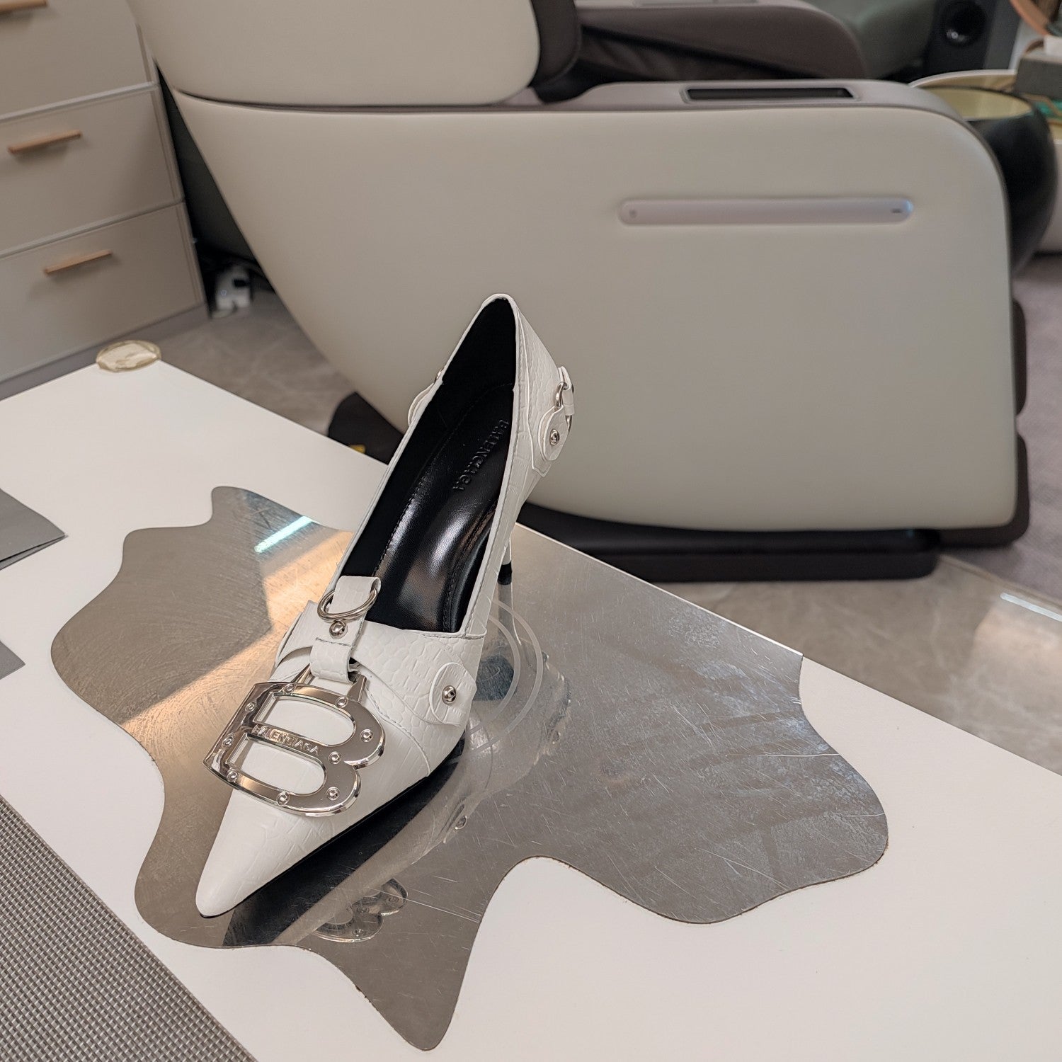 HIGH PUMPS WITH B SILVER BUCKLE IN WHITE CROCODILE PATTERN CALFSKIN