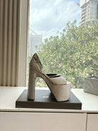 PLATFORM ANKLE STRAP HEELS IN BEIGE METALLIC ATTACHED RHINESTONES CALFSKIN