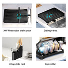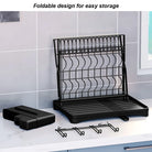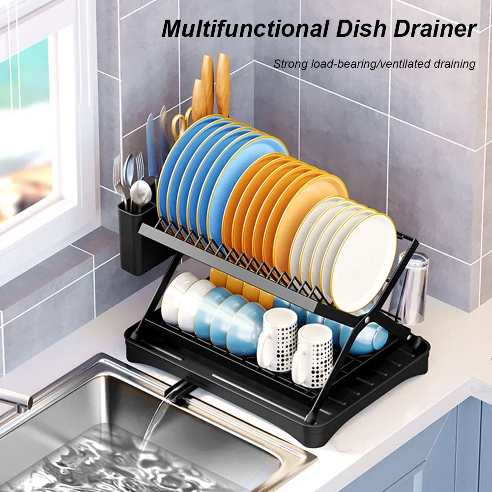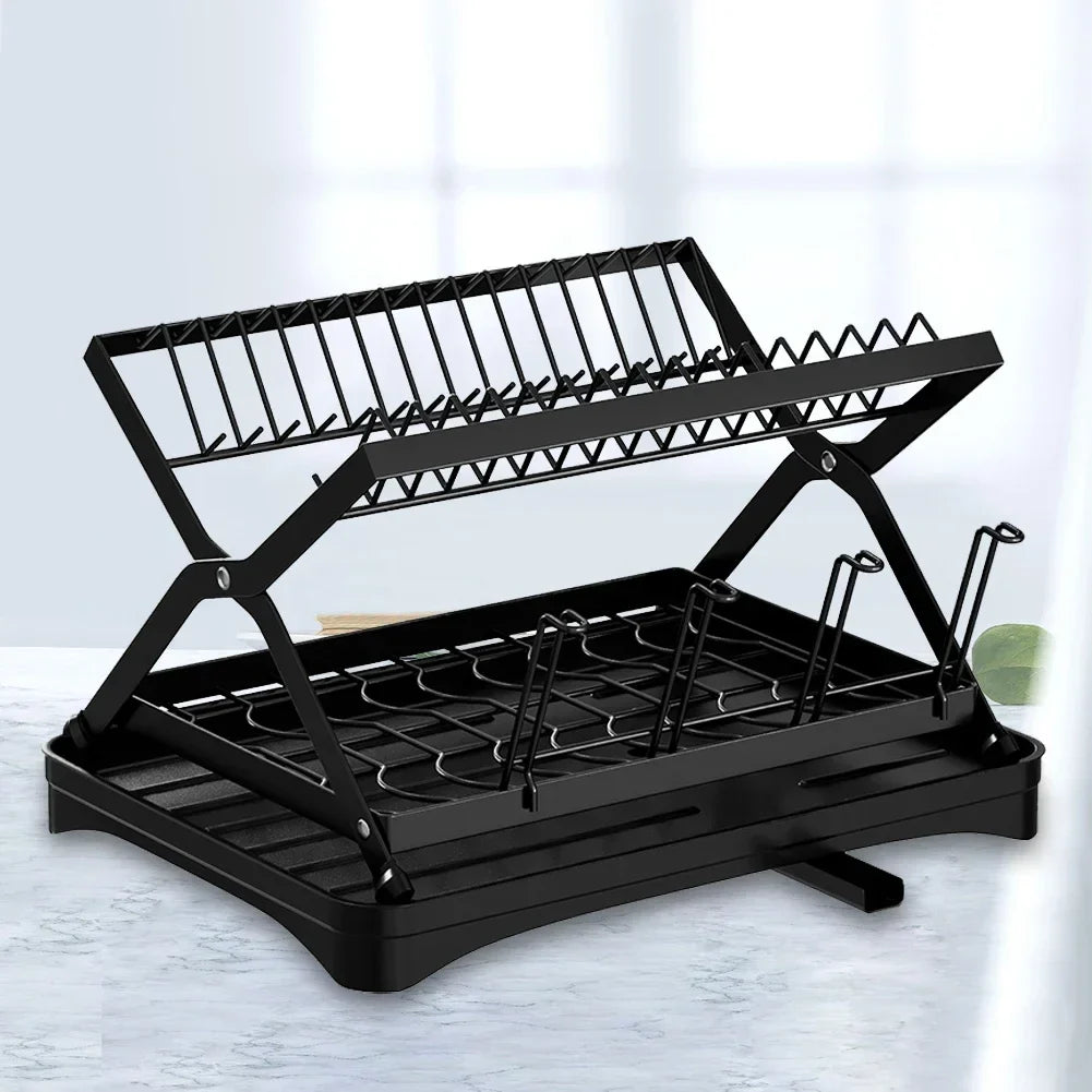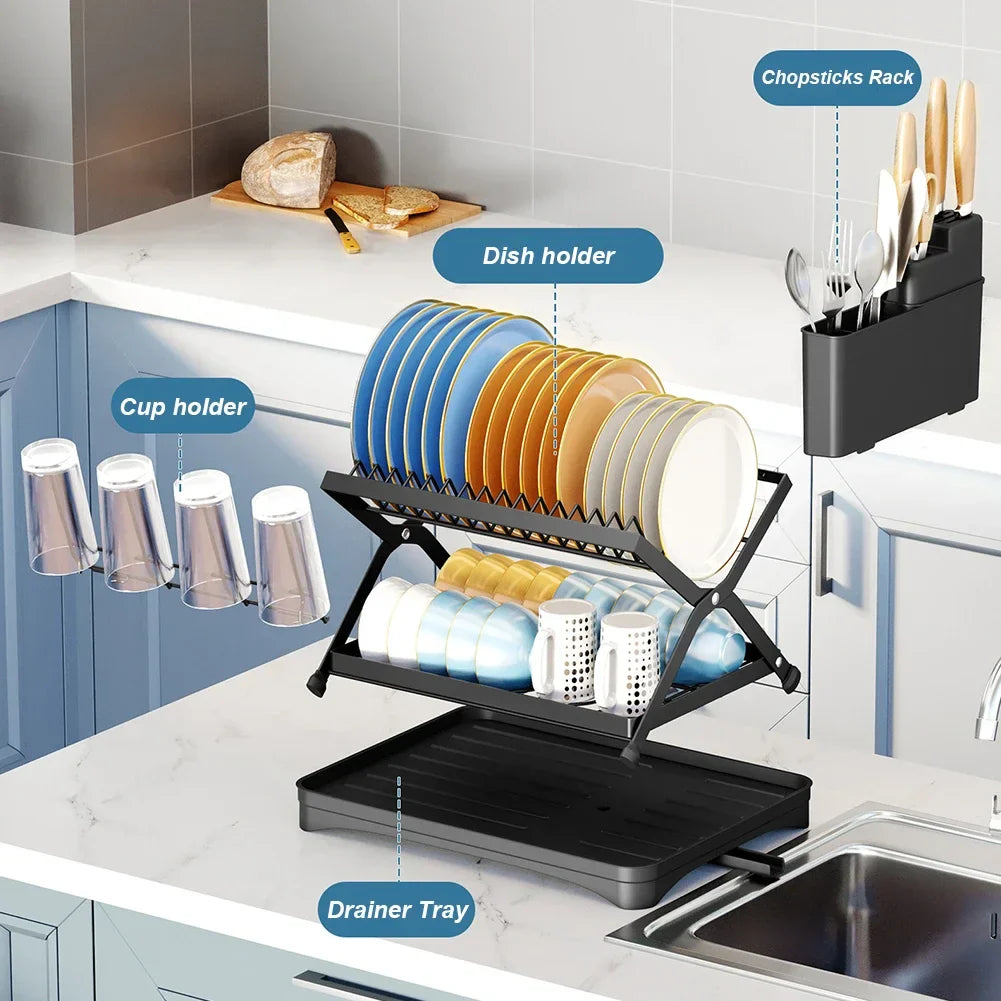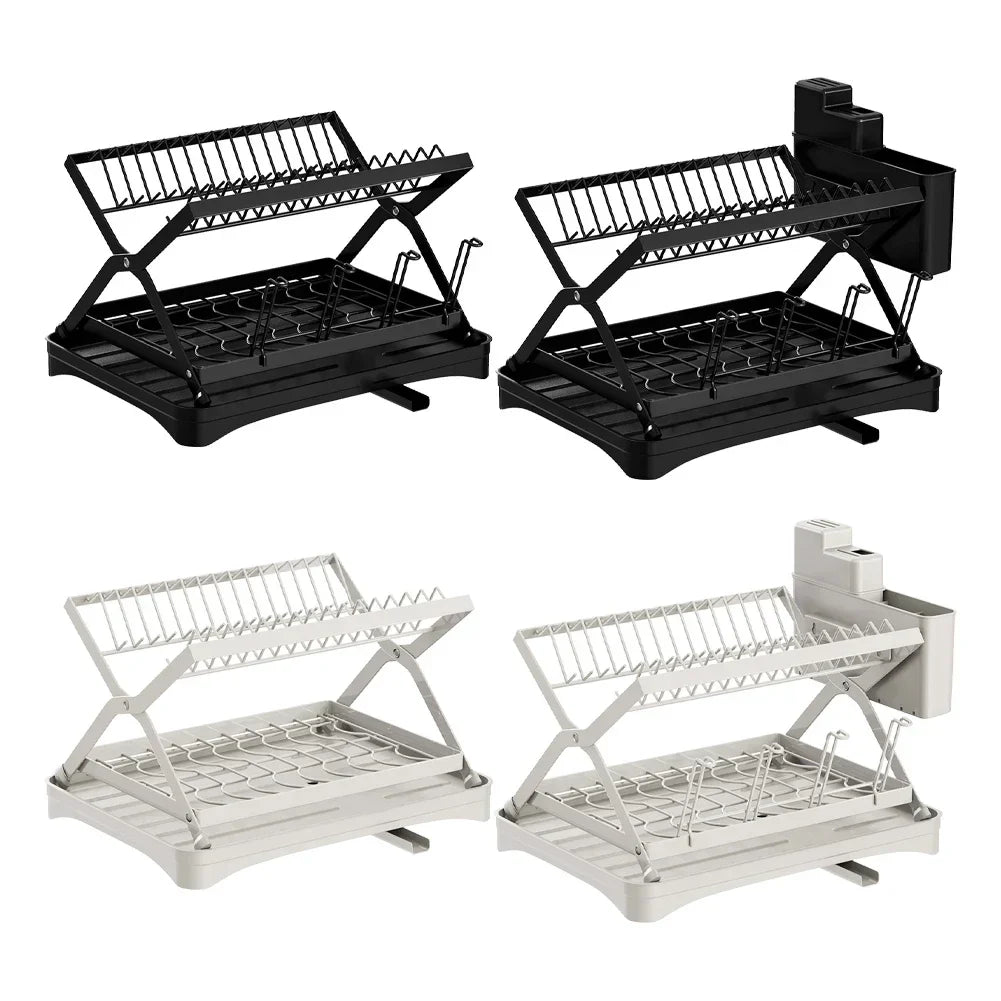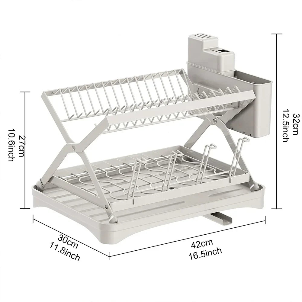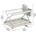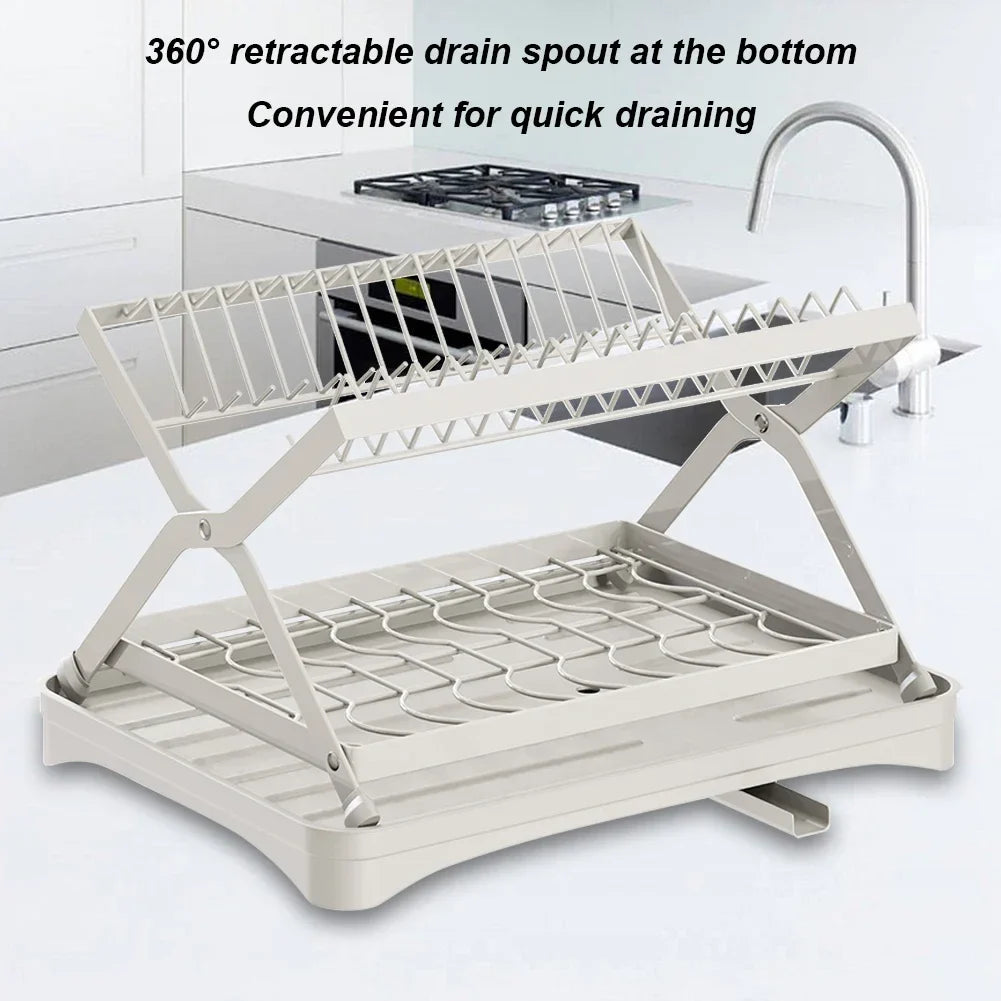 Organize your kitchen with this collapsible 2-tier dish drainer. Designed with a 360° retractable drainage spout, a dedicated cup holder, and a space-saving foldable design, it ensures a clutter-free countertop.