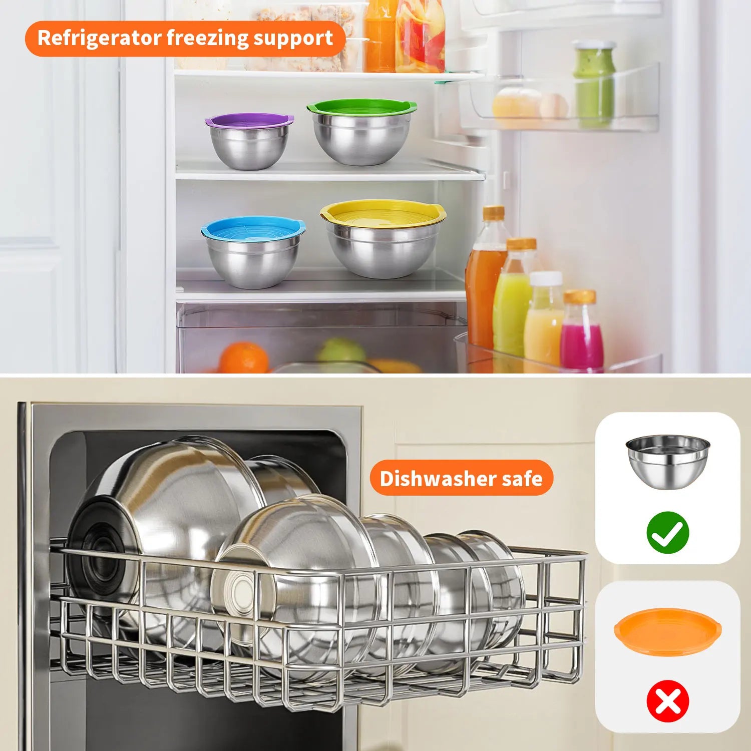 Crafted from high-quality, food-grade stainless steel, the bowls are built to last with a rust-resistant and odor-resistant finish. The non-slip silicone bases provide extra stability during mixing, while the tight-sealing lids keep contents fresh for longer. Perfect for beating eggs, tossing salads, kneading dough, or marinating ingredients.