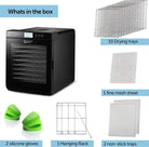 The digital thermostat and timer give you precise control over temperature and drying duration. With automatic shut-off functionality, you can enjoy hassle-free operation and perfectly dehydrated food every time. Its spacious design includes nine adjustable stainless-steel trays, mesh trays, and fruit roll sheets, accommodating everything from herbs to jerky.