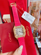 SANTOS LADY 35MM QUARTZ 35MM GOLD CASE DIAMOND BEZEL LEATHER