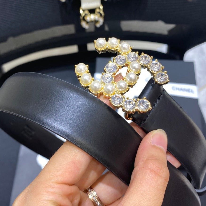 CC BELT 3.0CM LEATHER BLACK BUCKLE GOLD PEARL WHITE DIAMOND