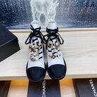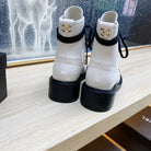 CC COMBAT BOOTS IN WHITE WRINKLED CALFSKIN AND BLACK GROSGRAIN WITH FAUX PEARL