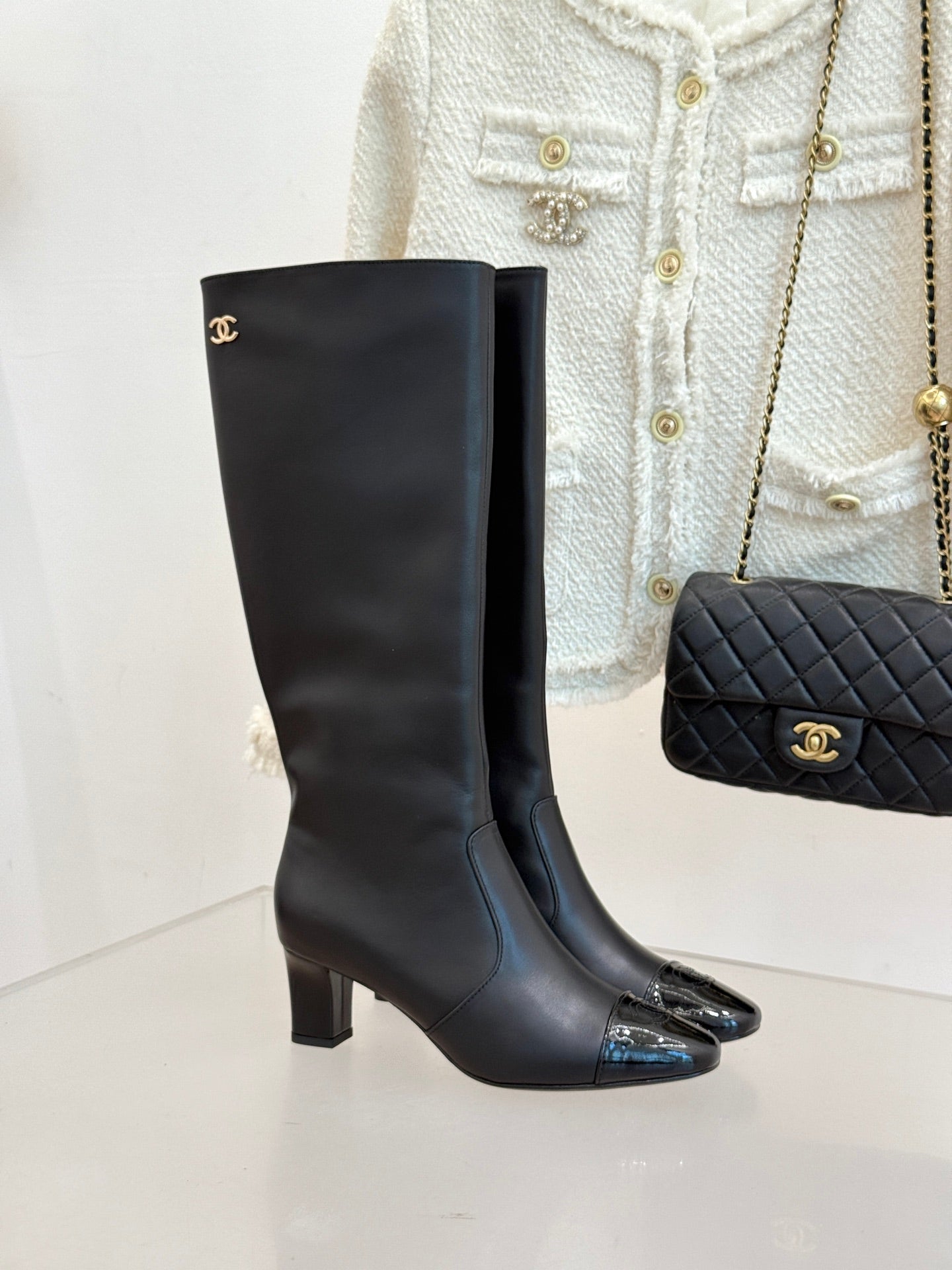 Chanel Double C Colorblock Heel Long Boot Black Sheepskin 465419