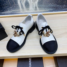 CC COMBAT OXFORD SHOES IN WHITE WRINKLED CALFSKIN AND BLACK GROSGRAIN WITH FAUX PEARL