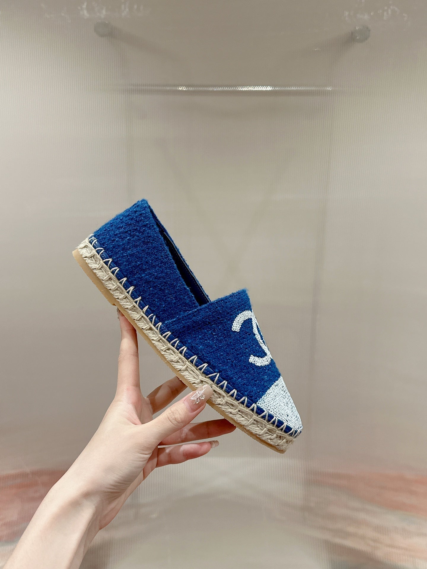 cc espadrilles blue cotton tweed white sequin