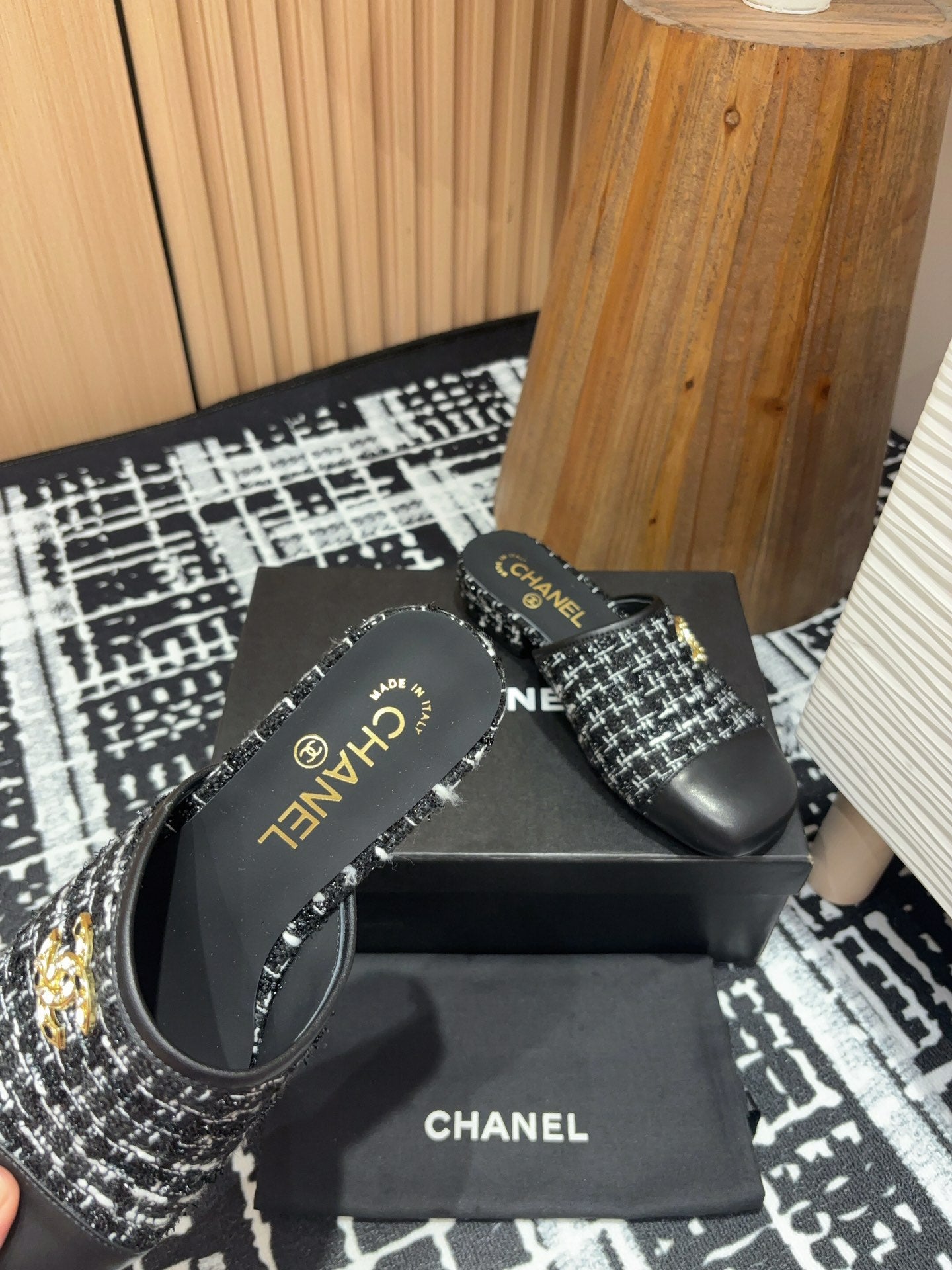 CC Mule 30mm In Black Mix White Wool Tweed And Lambskin