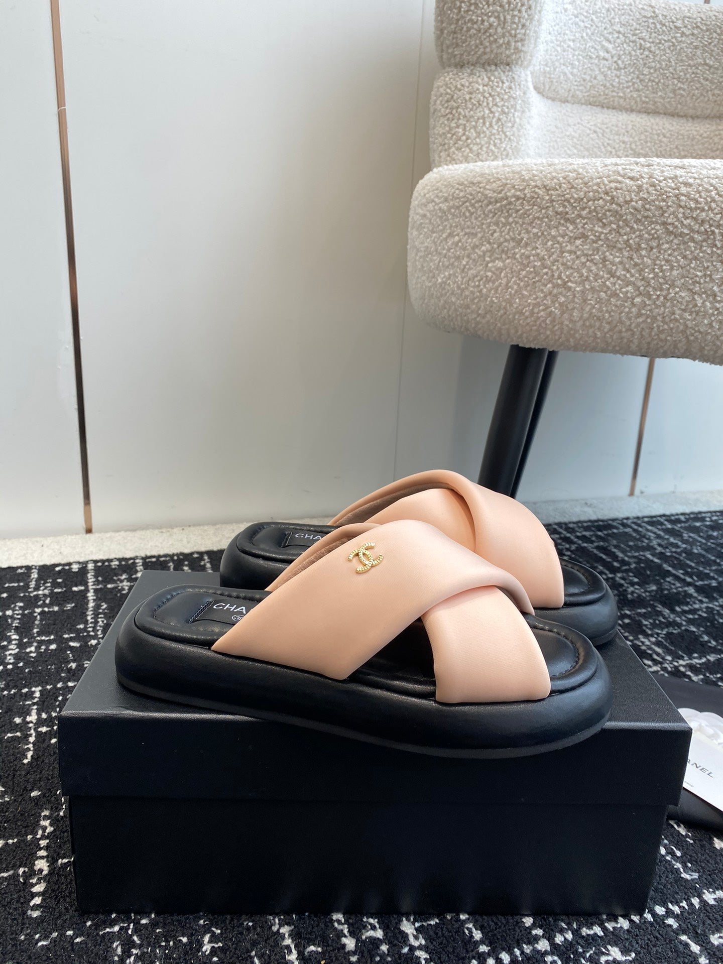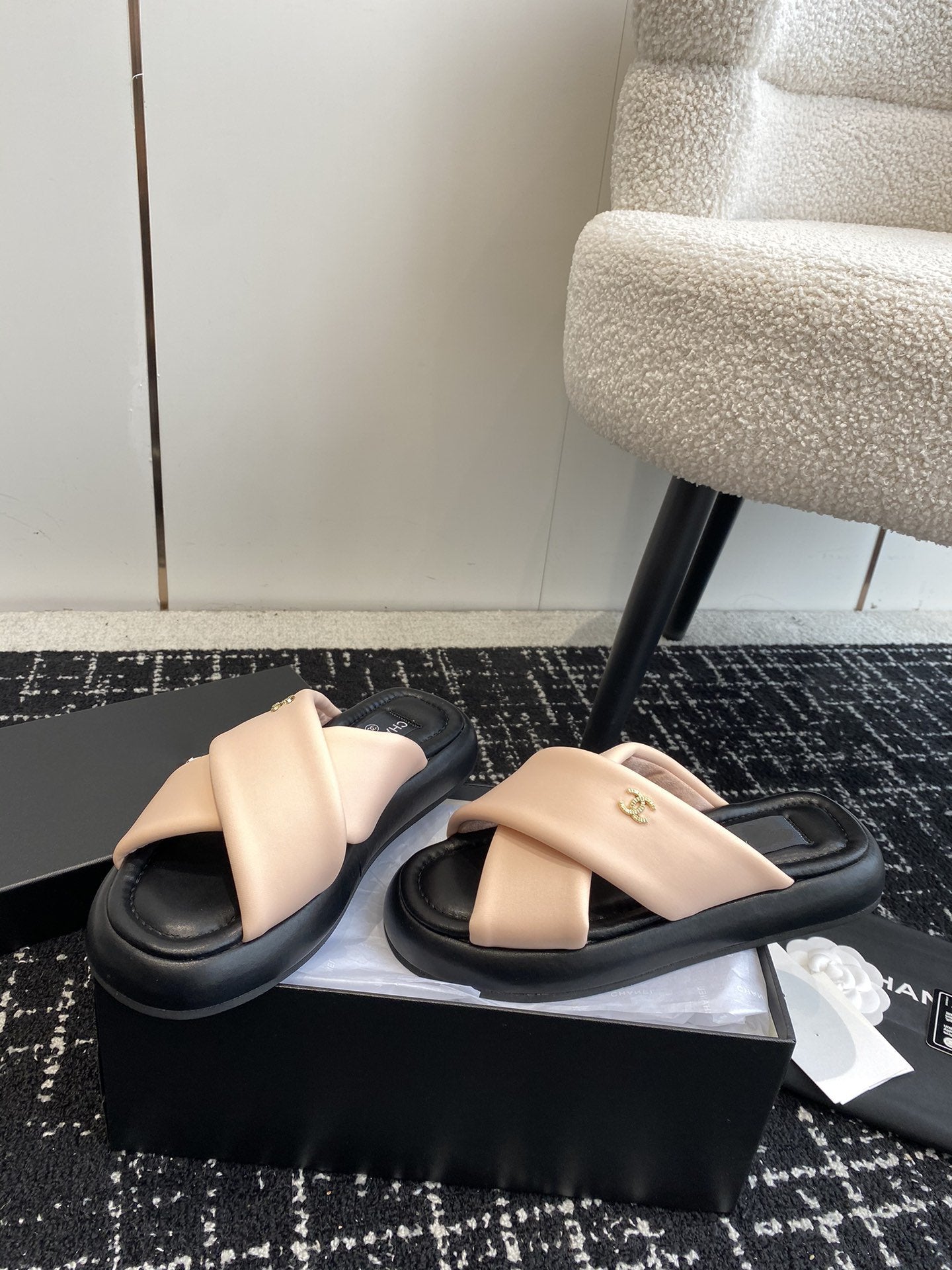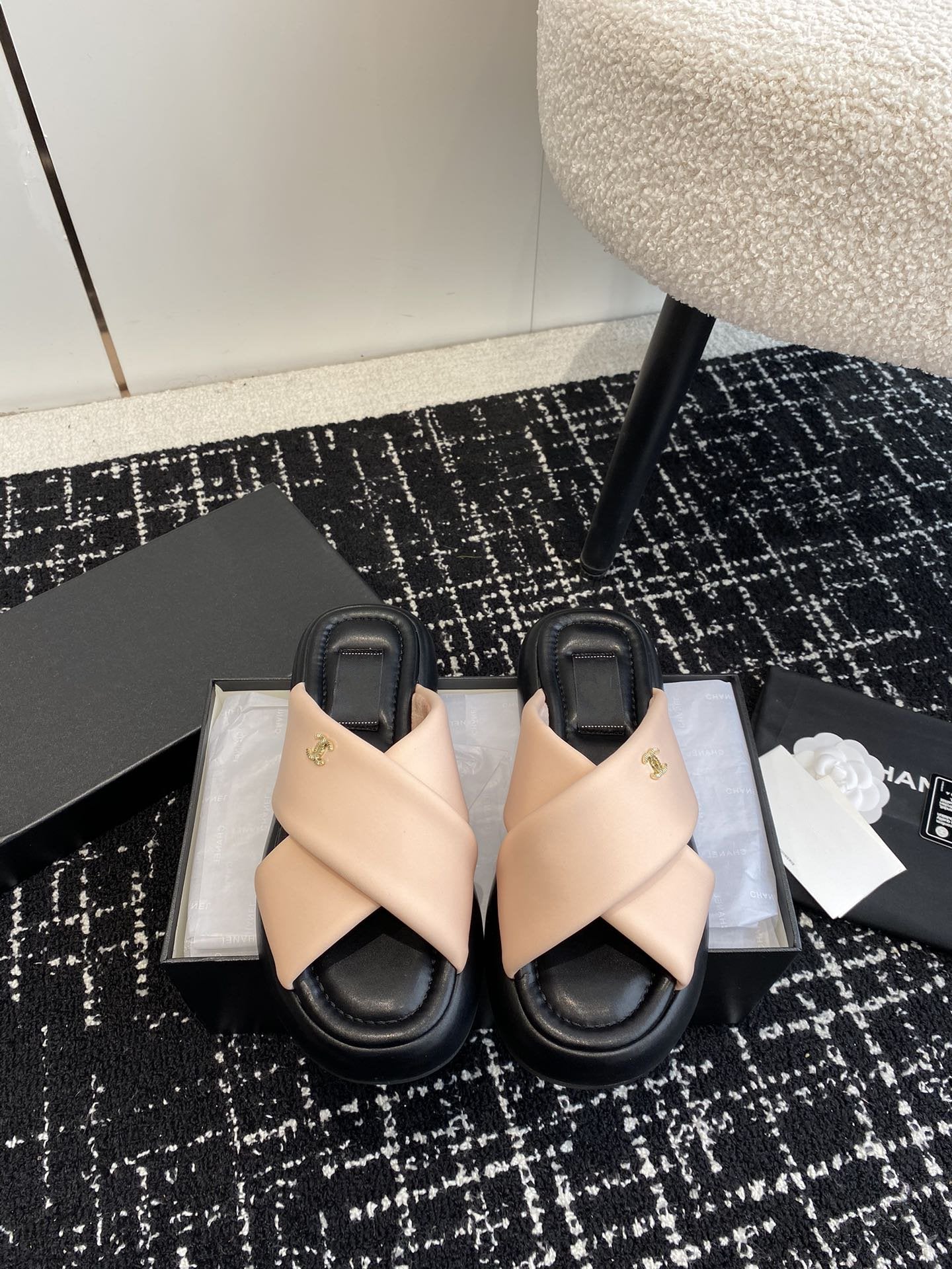 cross puffy slippers beige black lycra fabric