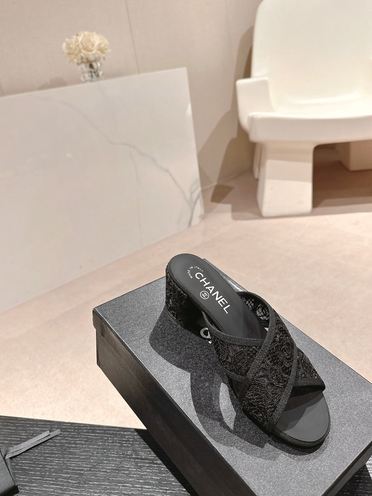 mule sandal 60 cross black lace fabric