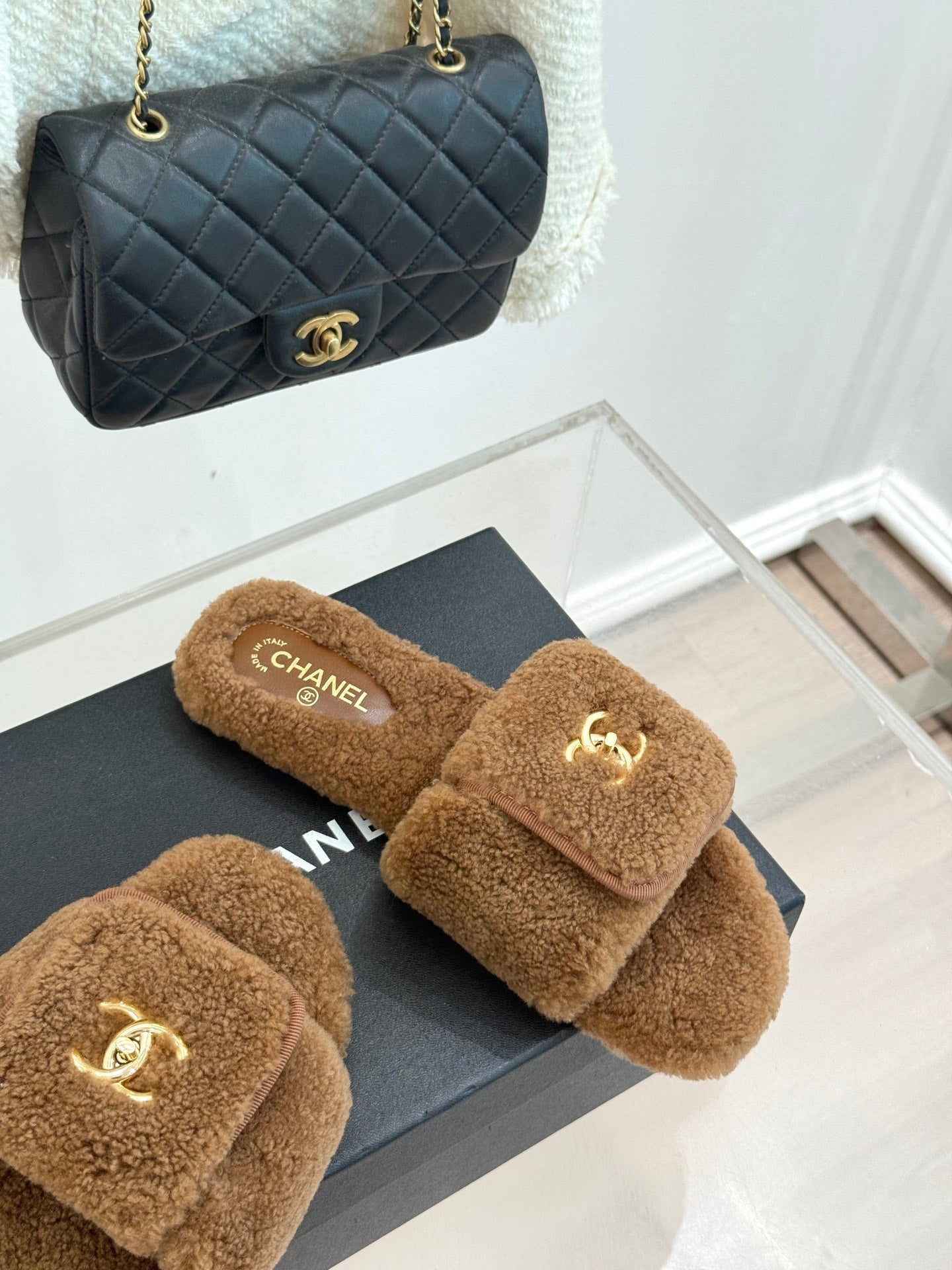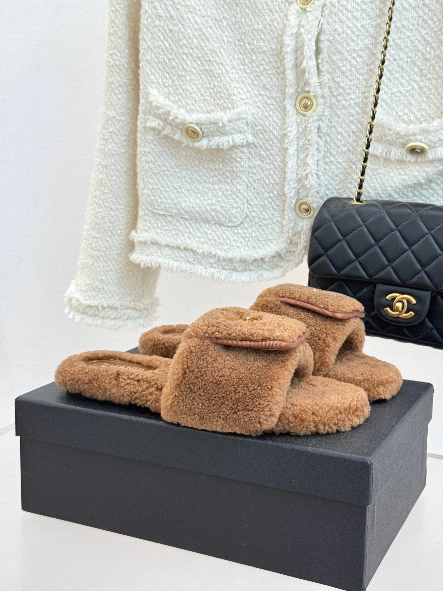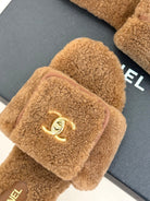 Chanel 25 Buckle Flip-up Thick-soled Slippers Brown Wool 465381