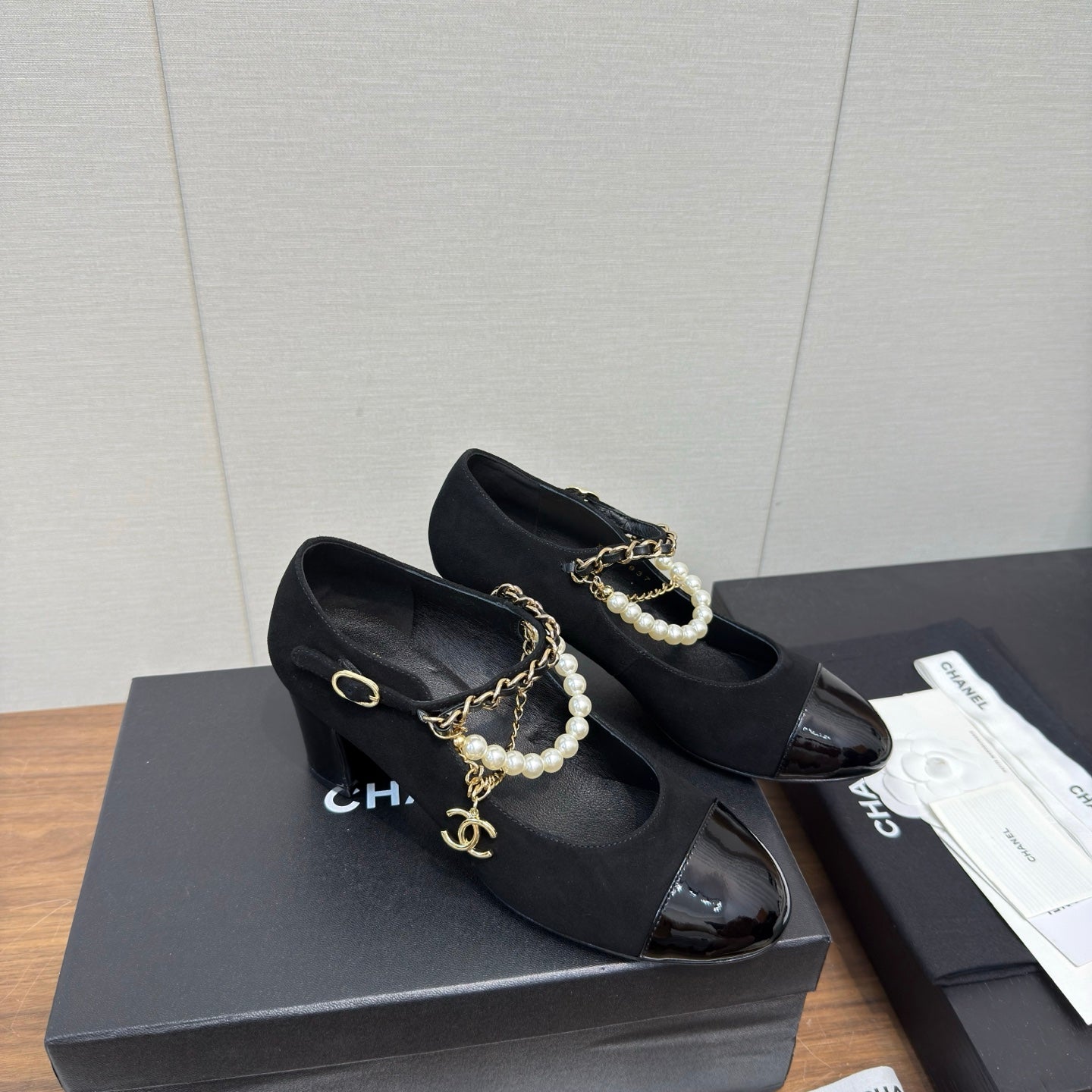 Chanel 25 Mary Jane Ankle Chain Pump Black Suede Cowhide 465599