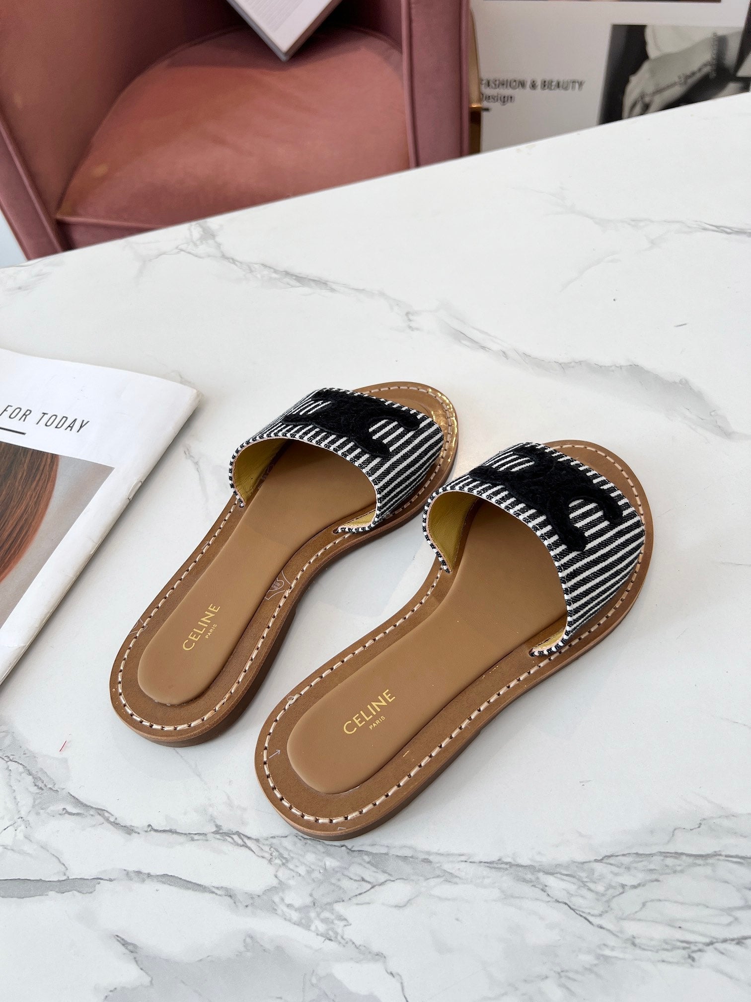 Celine 25C Slippers Black Fabric with Calfskin 238168