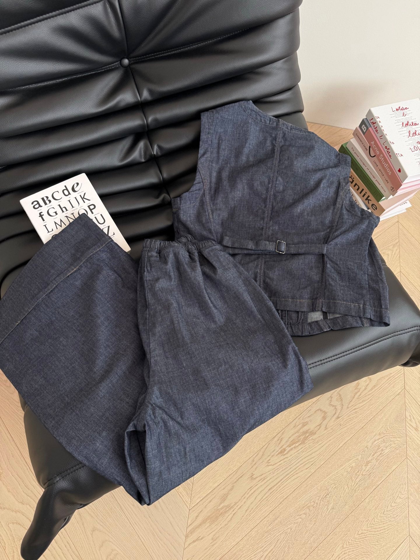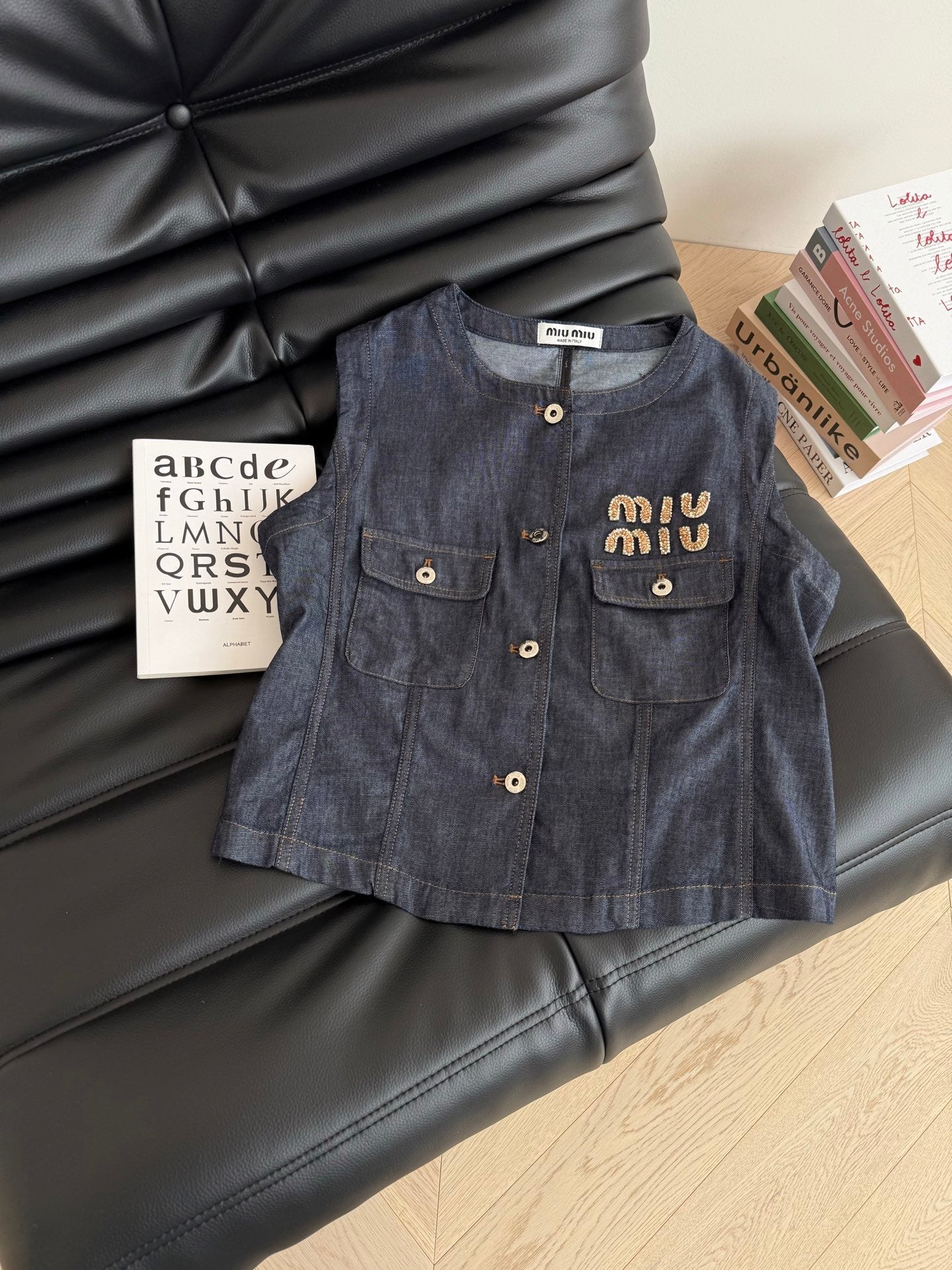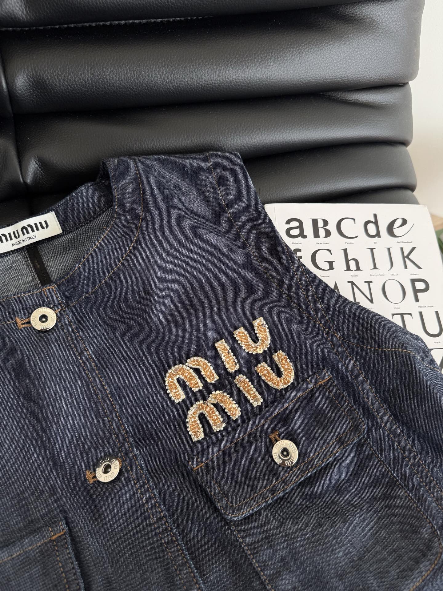 Miu Miu Beaded Letters Decorated Denim Suit Dark Blue Cotton