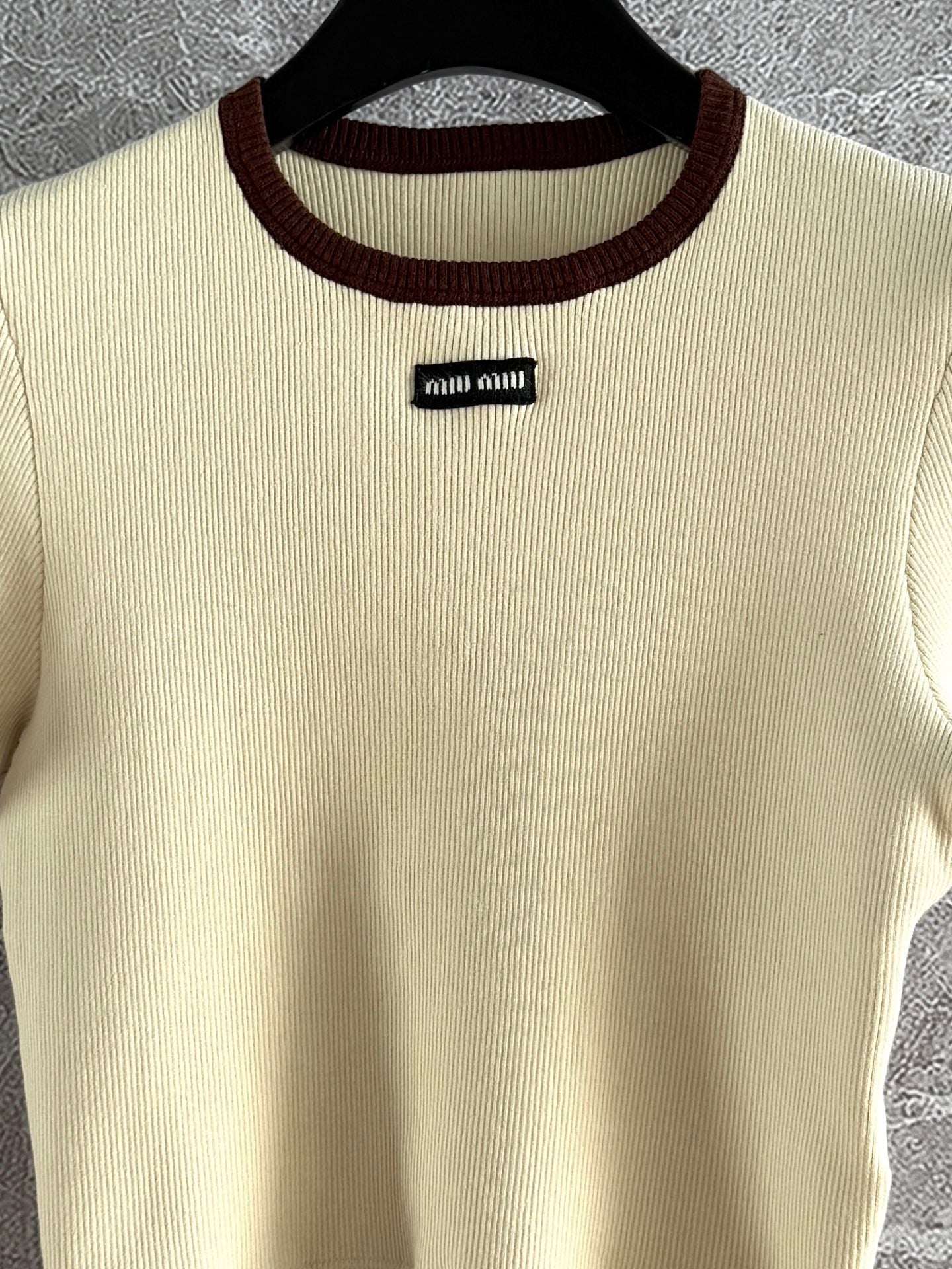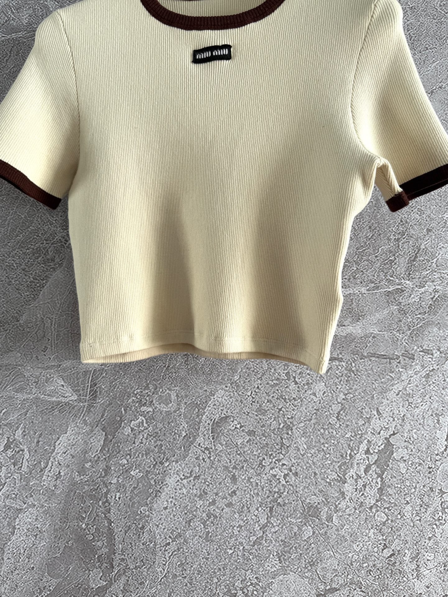 Miu Miu Short-sleeved Knitted Sweater Brown Cream Cotton