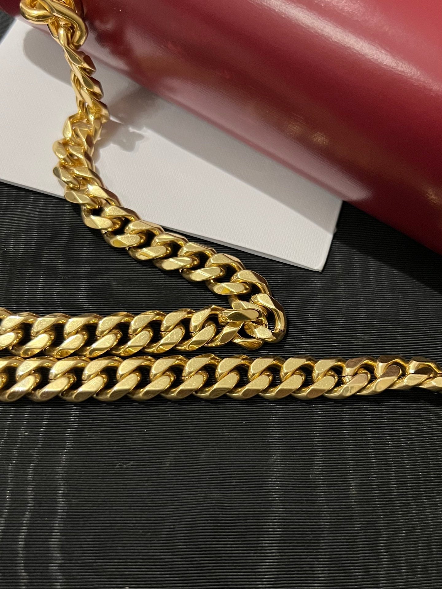 - Color: Red leather, gold hardware
