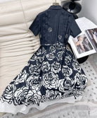 CD 2025 Floral Short-sleeved Belt Shirt Dress Black mix White Cotton