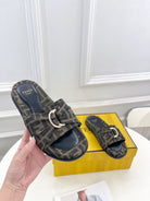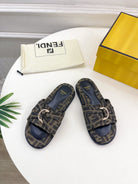 FENDI FLAT SLIPPER IN CEDAR BROWN MIX BLACK MONOGRAM JACQUARD FABRIC WITH GOLD HARDWARE