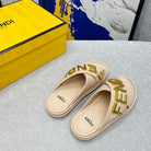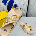 FENDI GRAPHY LOGO LETTERING SLIDES IN BEIGE LAMBSKIN WITH GOLD HARDWARE