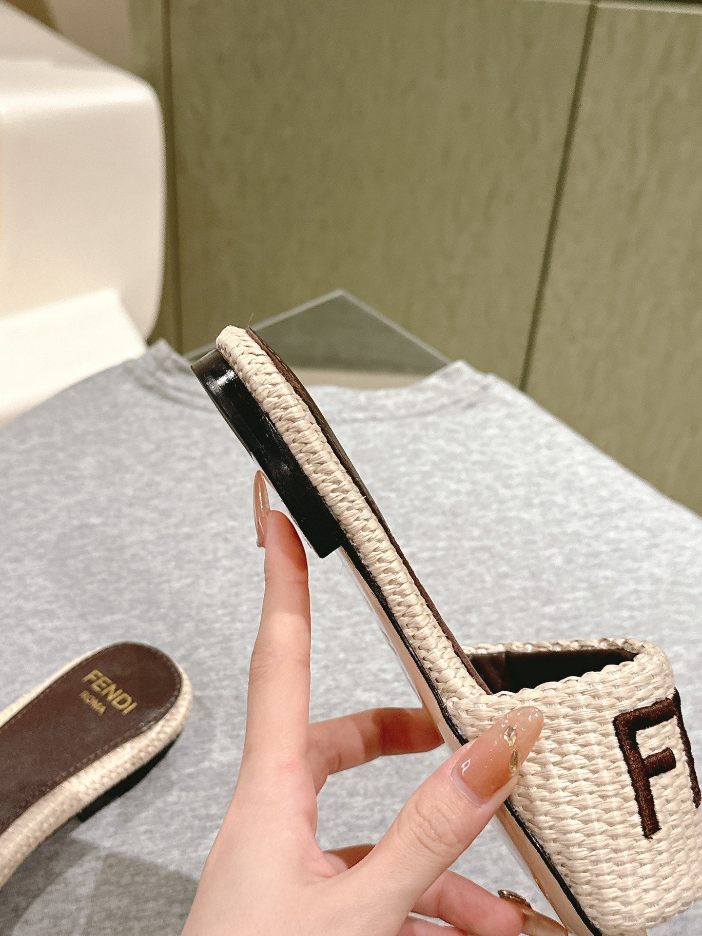 FENDI SIGNATURE MULE SLIDES IN WHITE FIBRE WITH BROWN EMBROIDERED LOGO