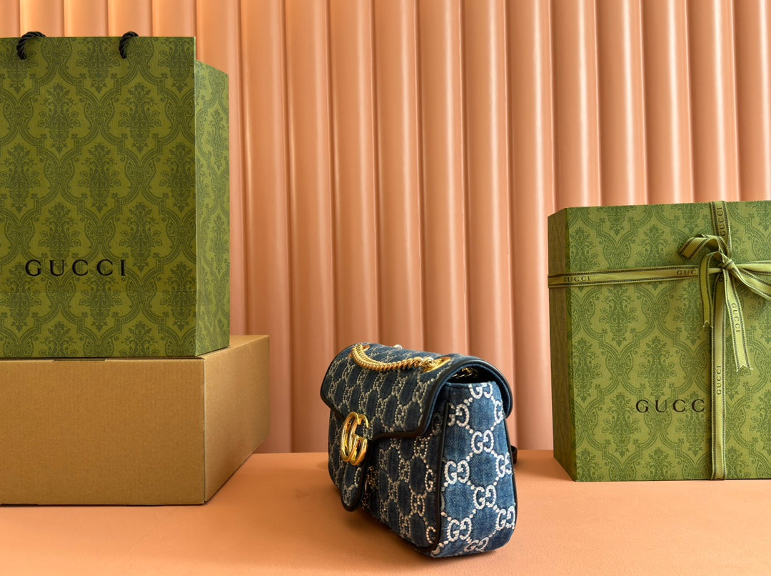 MARMONT SHOULDER BAG 26 IN BLUE DENIM WITH DOUBLE G CRYSTAL PATTERN GOLD HARDWARE