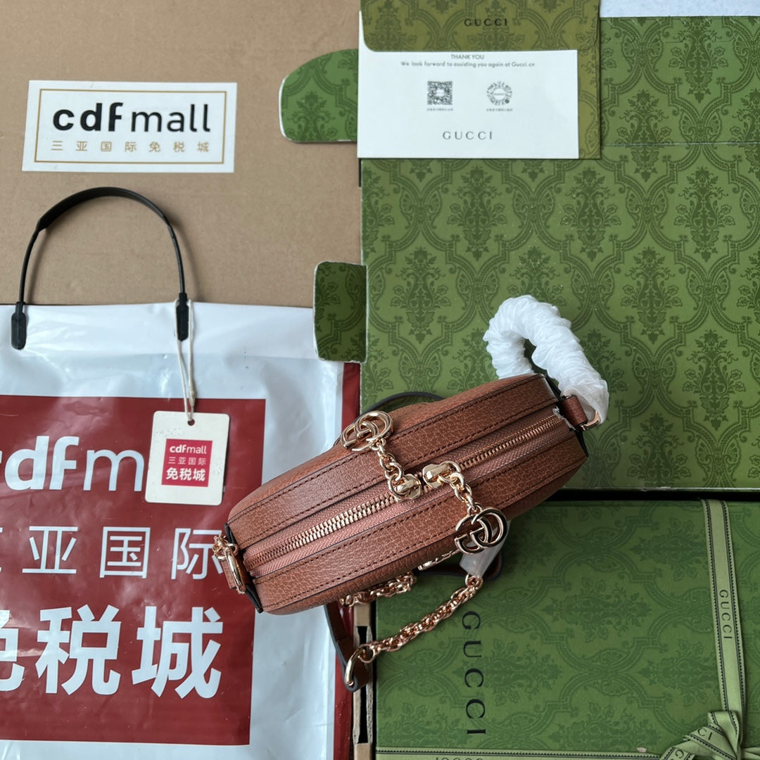 OPHIDIA MINI ROUND SHOULDER BAG 18 IN BLUSH PINK CANVAS AND BROWN LEATHER TRIM