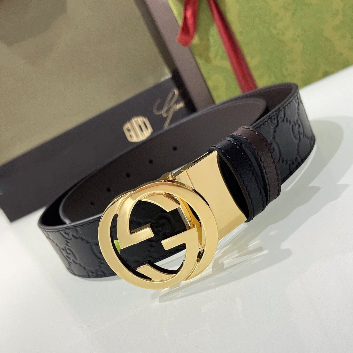 INTERLOCKING G GOLD BUCKLE 37MM BLACK BROWN LEATHER