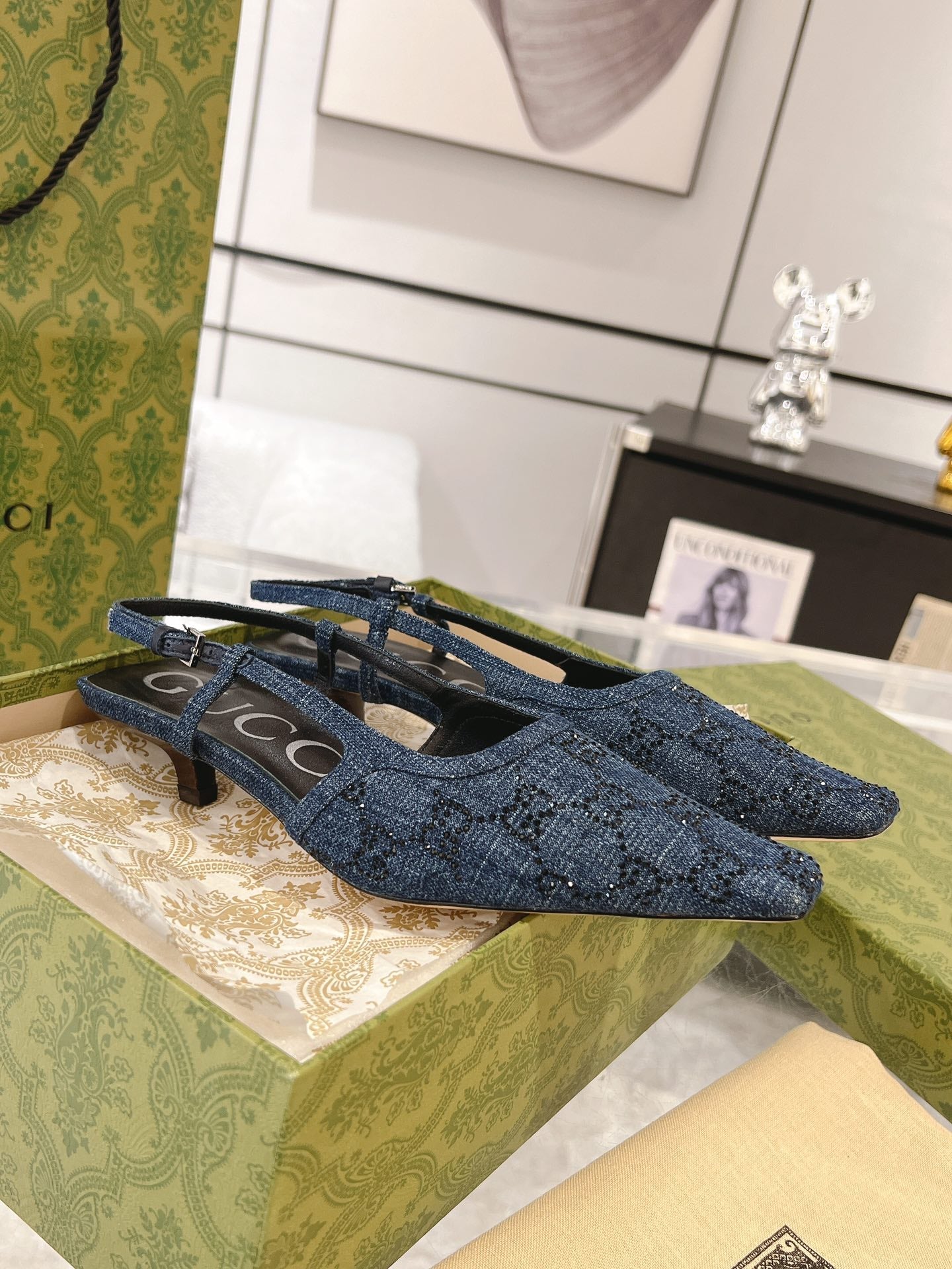 GG CRYSTALS SLINGBACK PUMP DENIM FABRIC