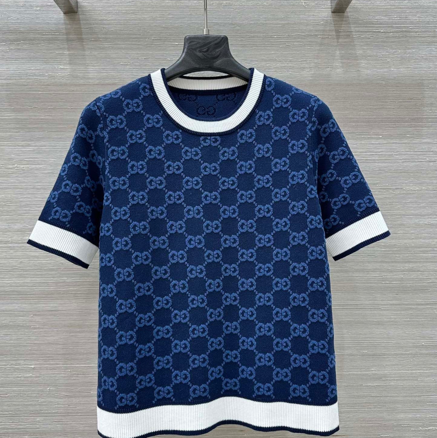 Gucci 25 Knitted Round Neck Short-sleeved Top Dark Blue Wool