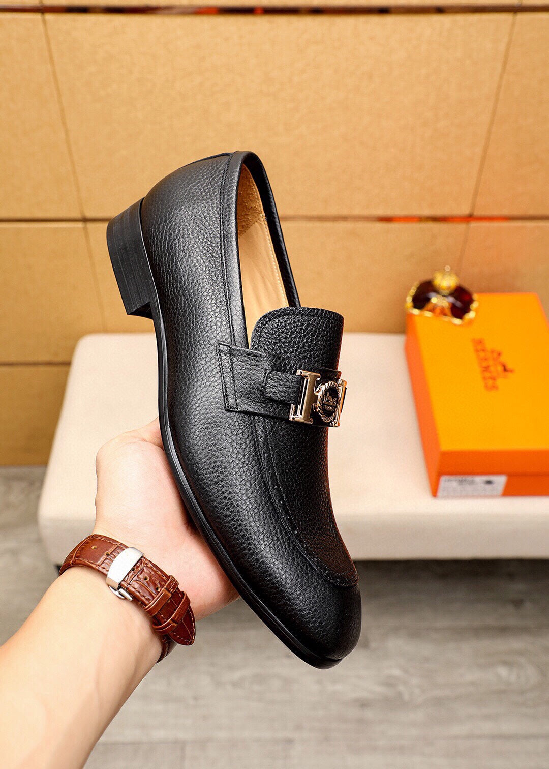 HM GOLD H-BUCKLE LOAFER BLACK GRAINED CALFSKIN