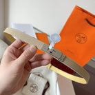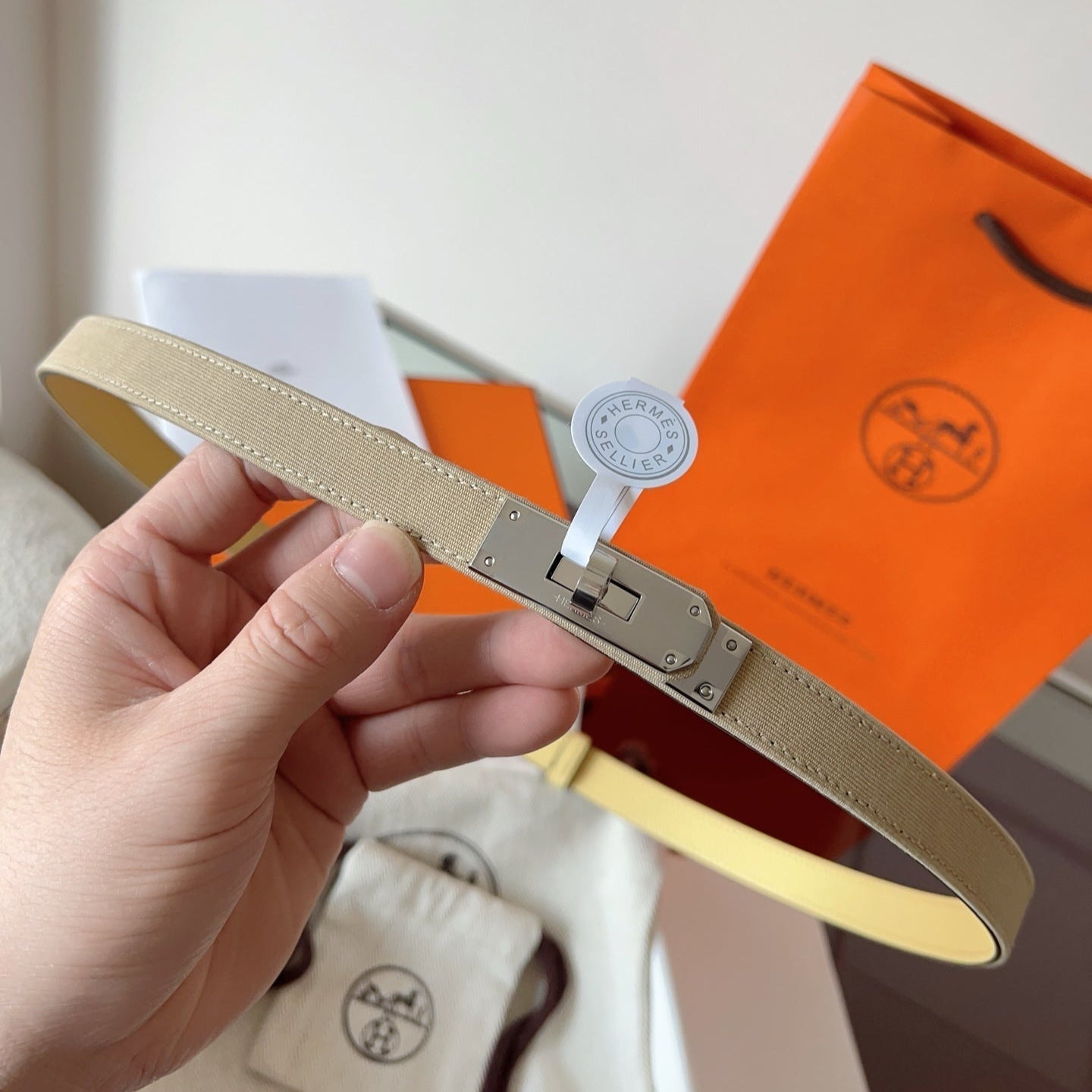 HM Kelly Belt 18mm Beige Canvas Epsom Leather Silver Buckle