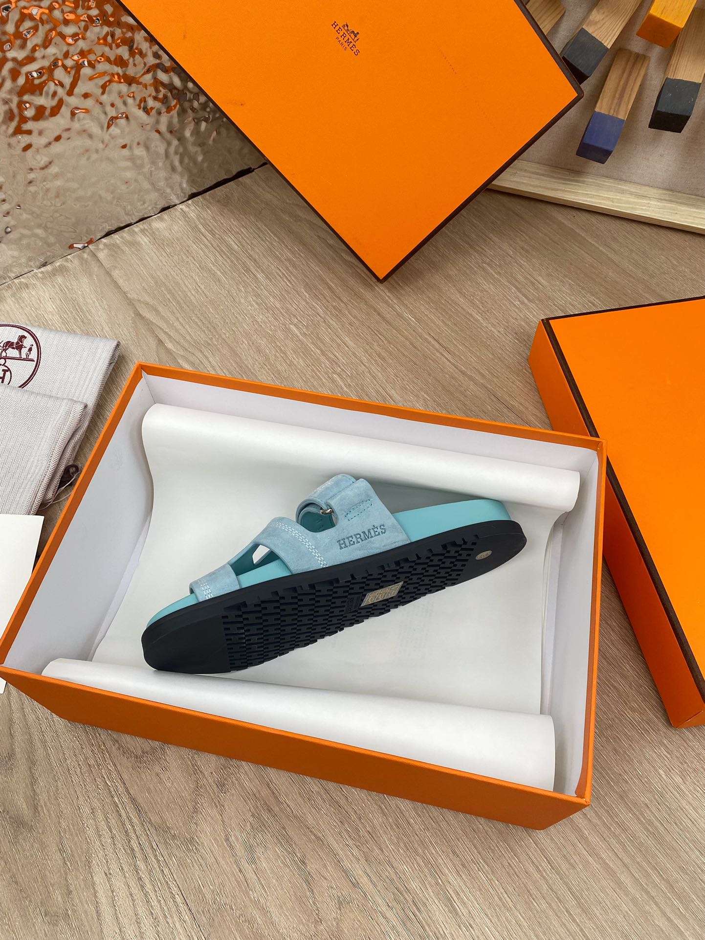 chypre sandal turquoise blue suede calfskin white thread embroidered