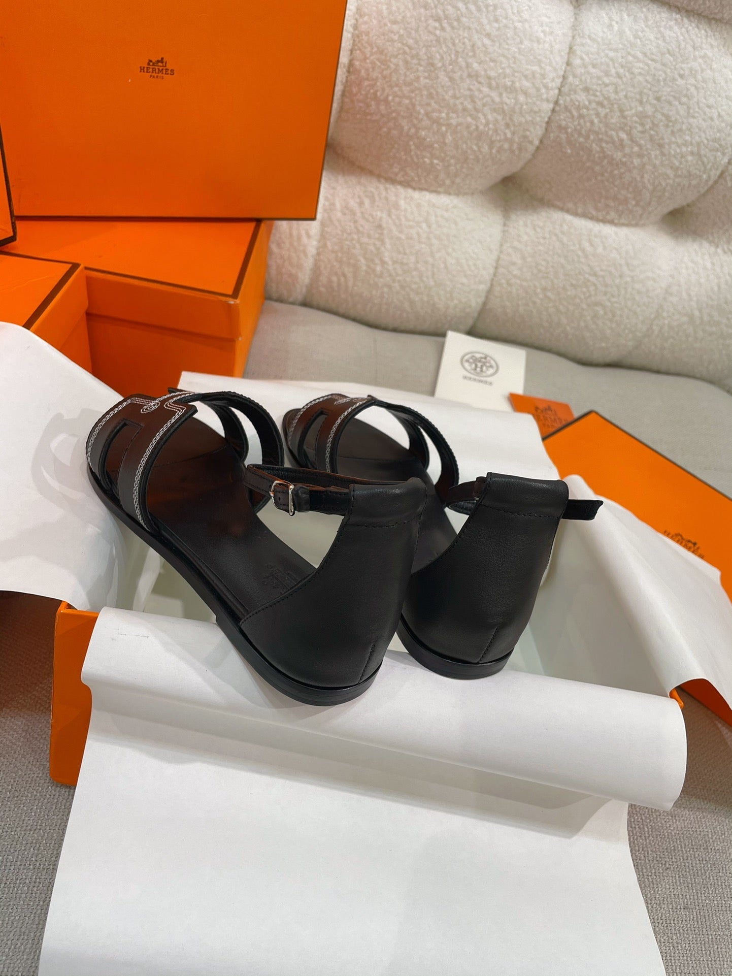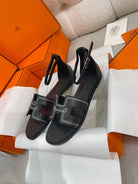 - Material: Sandal in Clafskin with straight cut edges, "H" cut-out detail and thin ankle strap.