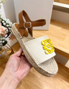 Loew Anagram Yellow logo White Brown Leather And Canvas Espadrille Sandals