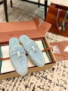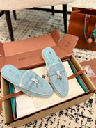Loro Piana Blue Sky White Suede Charms Walk Flat Mules