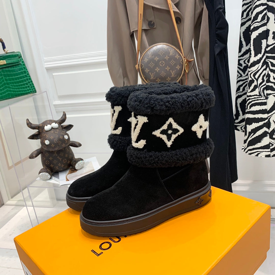 LV Snowdrop Flat Ankle Boot Black Mix White Monogram White Suede