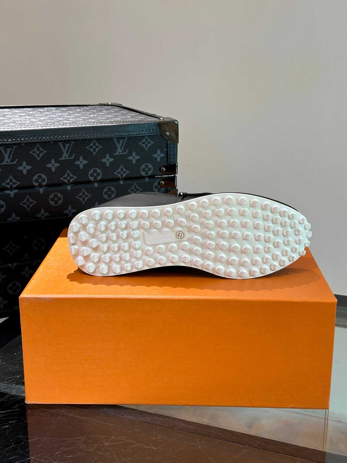 • The monochromatic rubber outsole is adorned with Monogram flowers.
