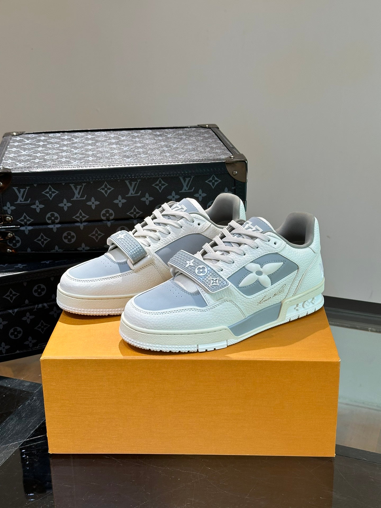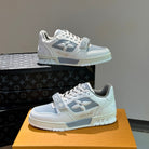 LV TRAINER SNEAKERS IN WHITE CALFSKIN AND LIGHT BLUE SUEDE