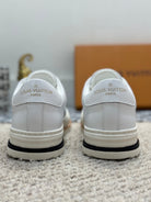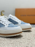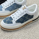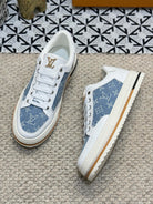 LV TRAINERS IN WHITE CALFSKIN AND SAPPHIRE BLUE JACQUARD