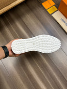 SNEAKERS IN GREY MESH BREATHABLE FABRIC AND BLUE MIX ORANGE CALFSKIN
