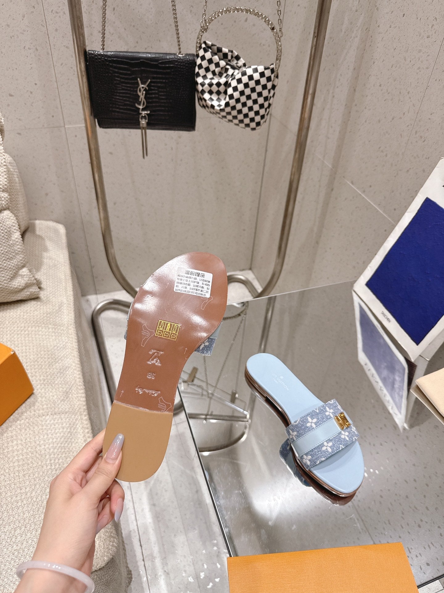 LV Flat Mules pairs raffia baby blue mix denim cowhide 383719