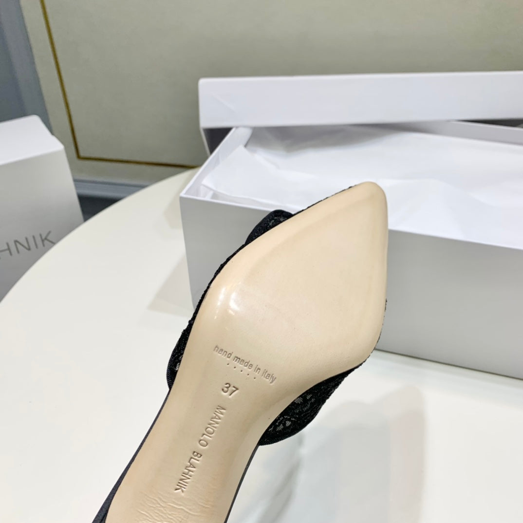 Manolo Mules 7cm Black Hollow Lace Leather Bottom 451197