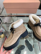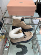 Miu Short Wool Boots Khaki Brown Open-Hemmed Cowhide