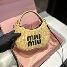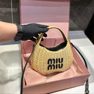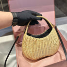 WANDER WICKER HOBO BAG 23 IN TAN BROWN HANDWOVEN WITH BLACK CALFSKIN LOGO