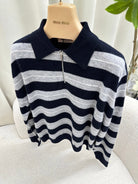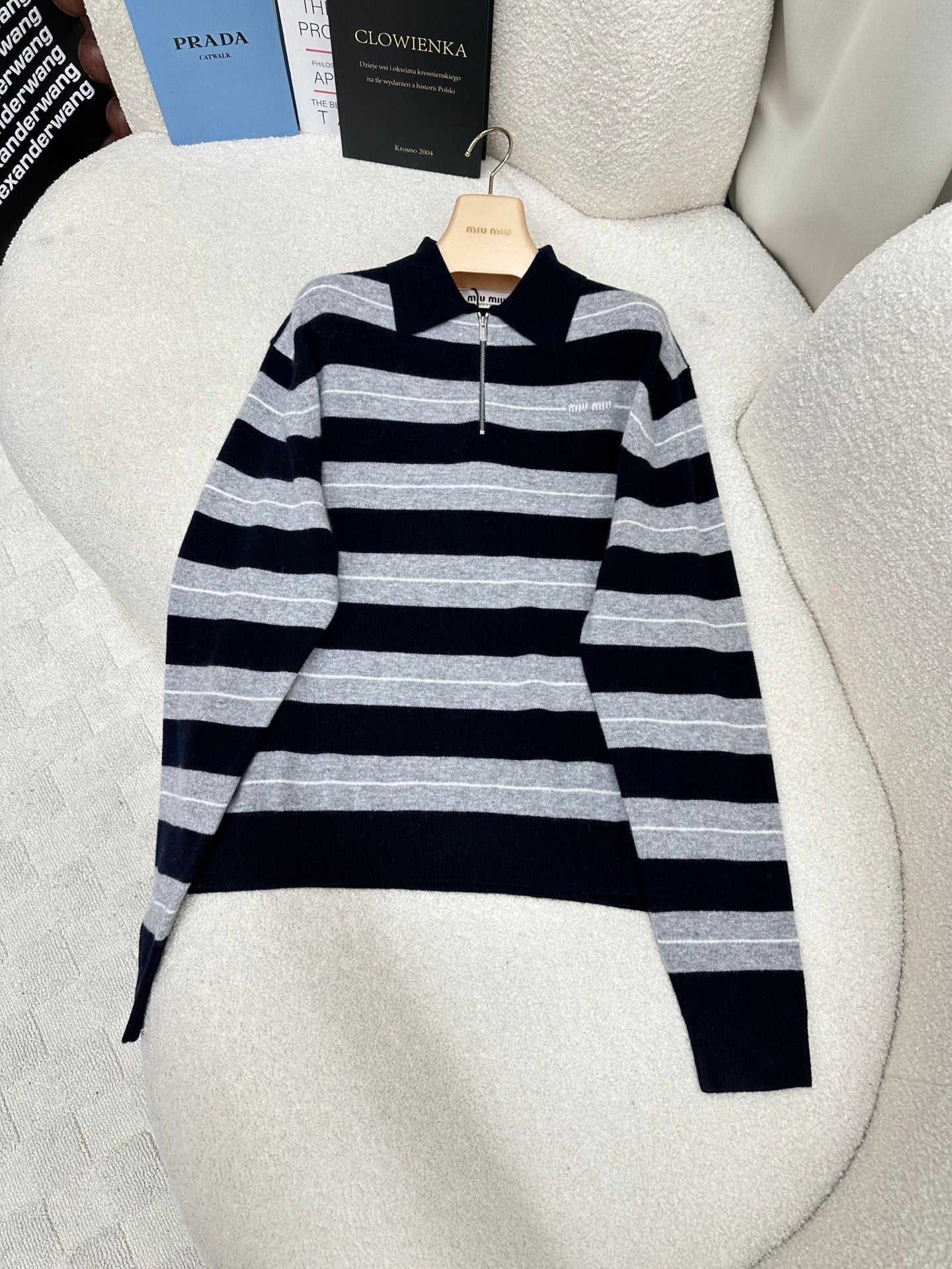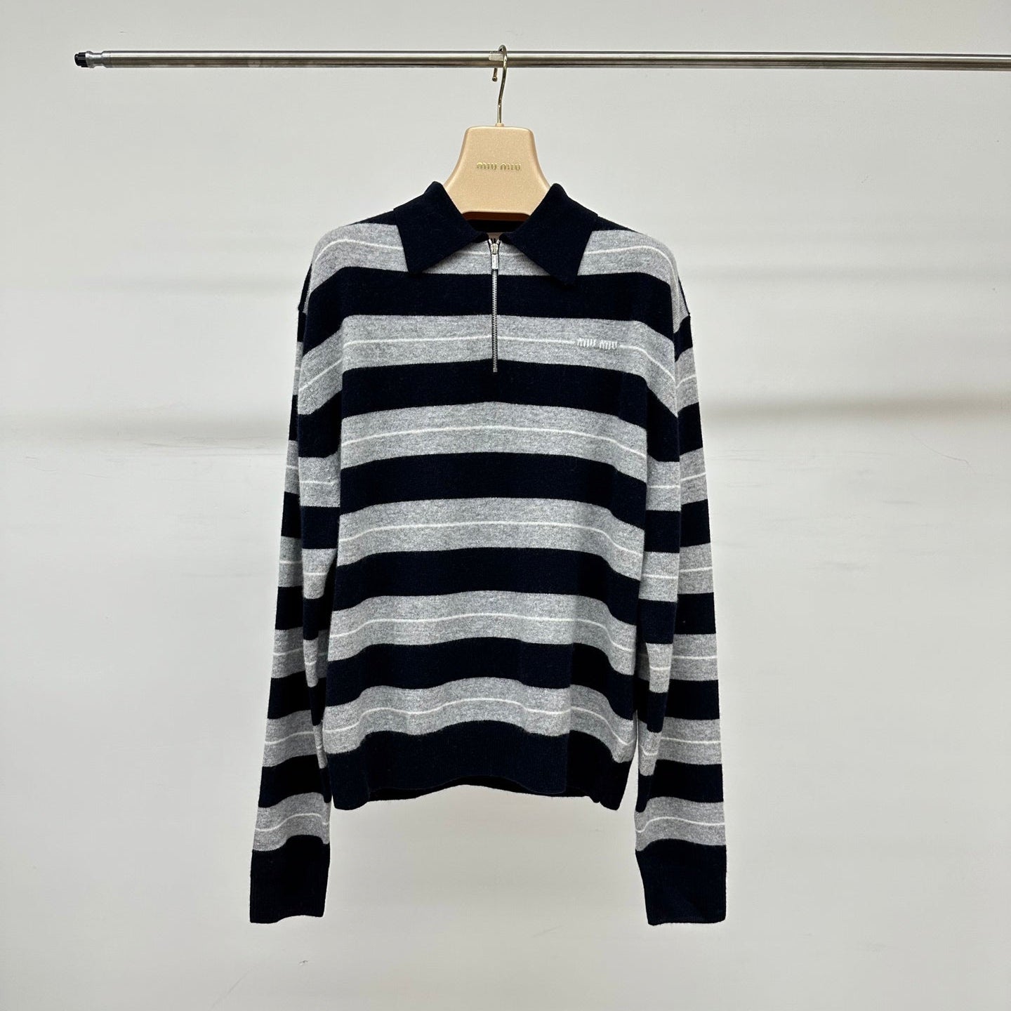 Miu Miu 25 Striped Polo Neck Sweater Navy Blue Gray Cashmere