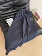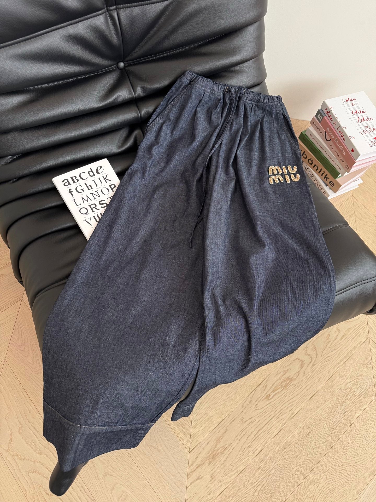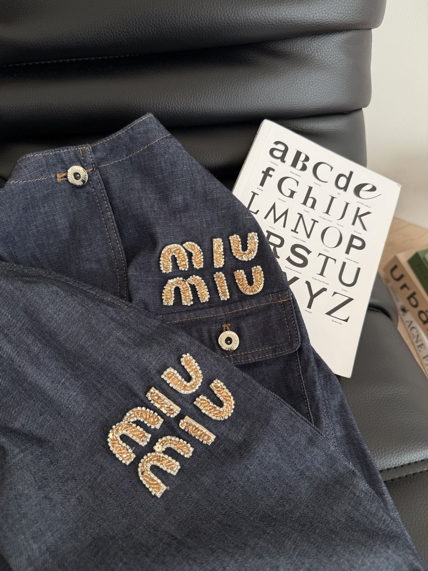 Miu Miu Beaded Letters Decorated Denim Suit Dark Blue Cotton